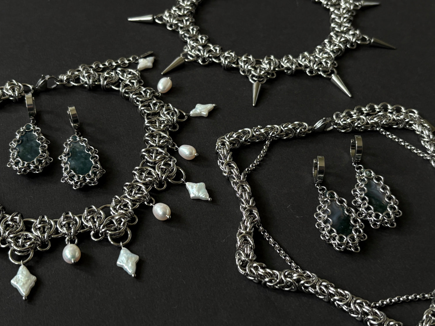 Statement necklaces, unique earrings, staple bracelets and distinctive chainmail accessories are all handmade in England from stainless steel, semi-precious stones and a whole lot of love. Our jewellery is dark and grungy, light and elegant, inspired by gothic architecture and historic fashion. We like to mix heavy and cold masculine elements with delicate feminine glamour to create wearable art that transcends gender. If this sounds like a bit of you, welcome to Bad Times Designs!