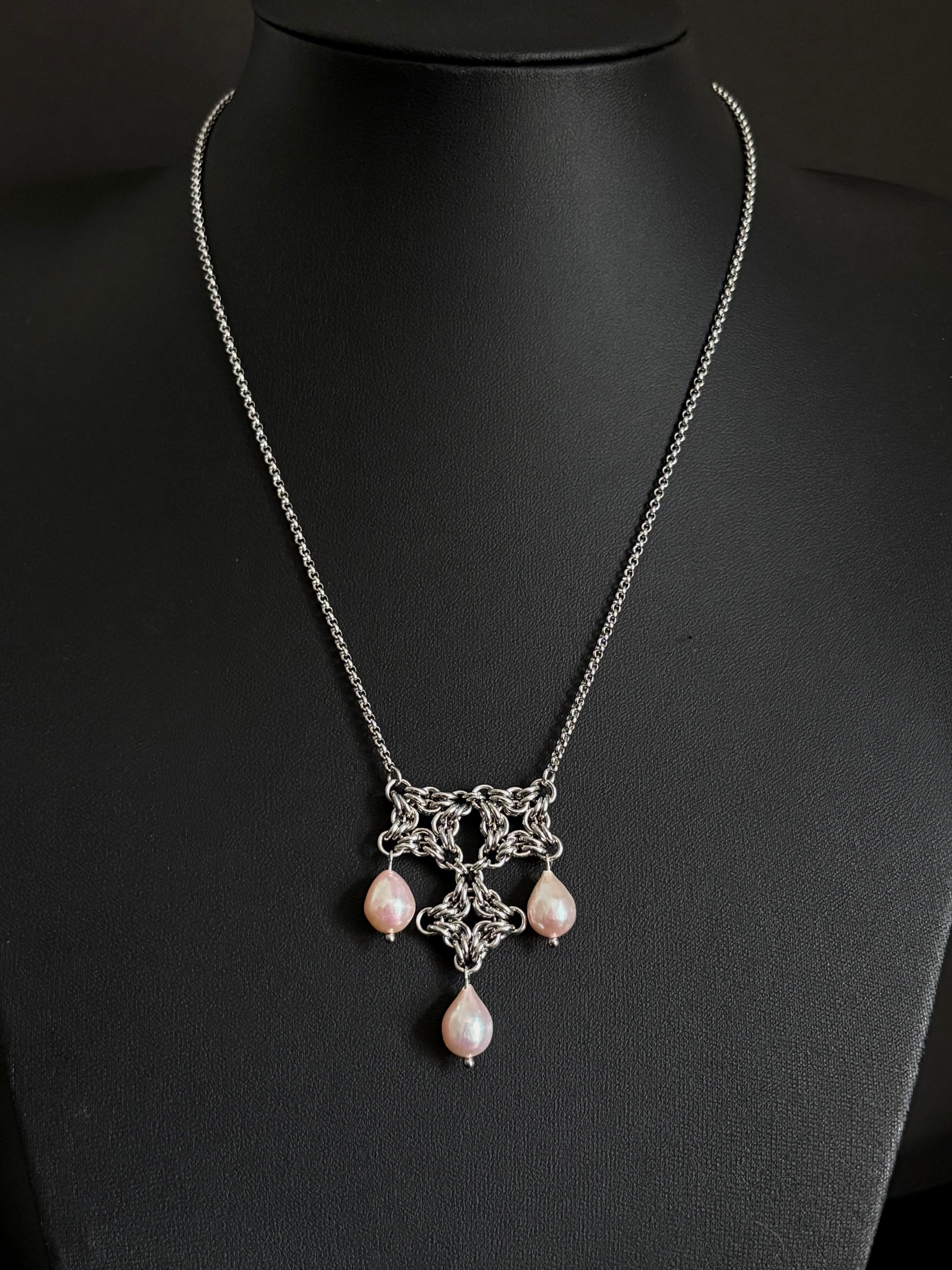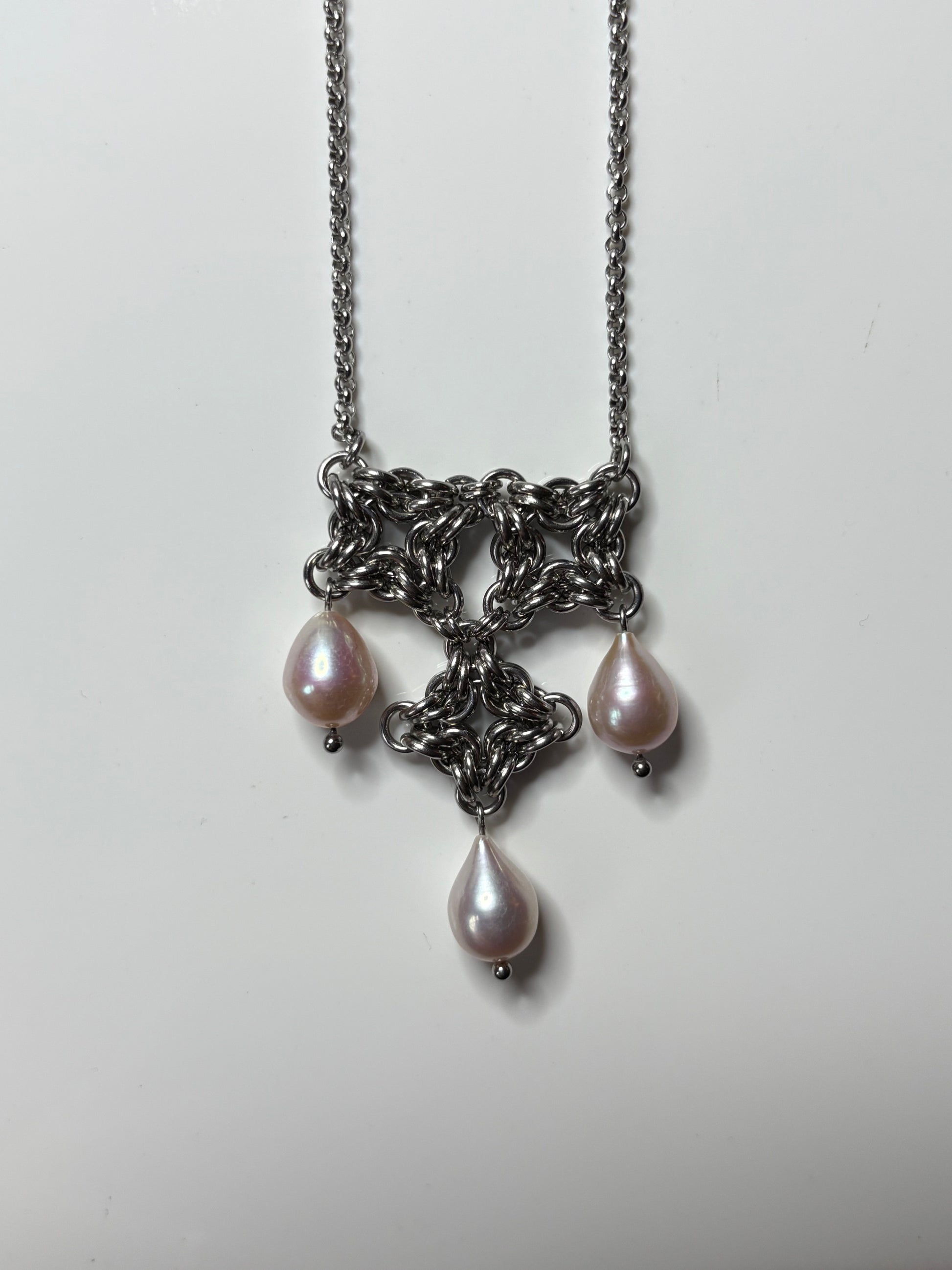 Regal, delicate, understated glamour. Handmade from stainless steel, weaved into an intricate pattern with three pink-toned freshwater pearls hanging from the bottom.