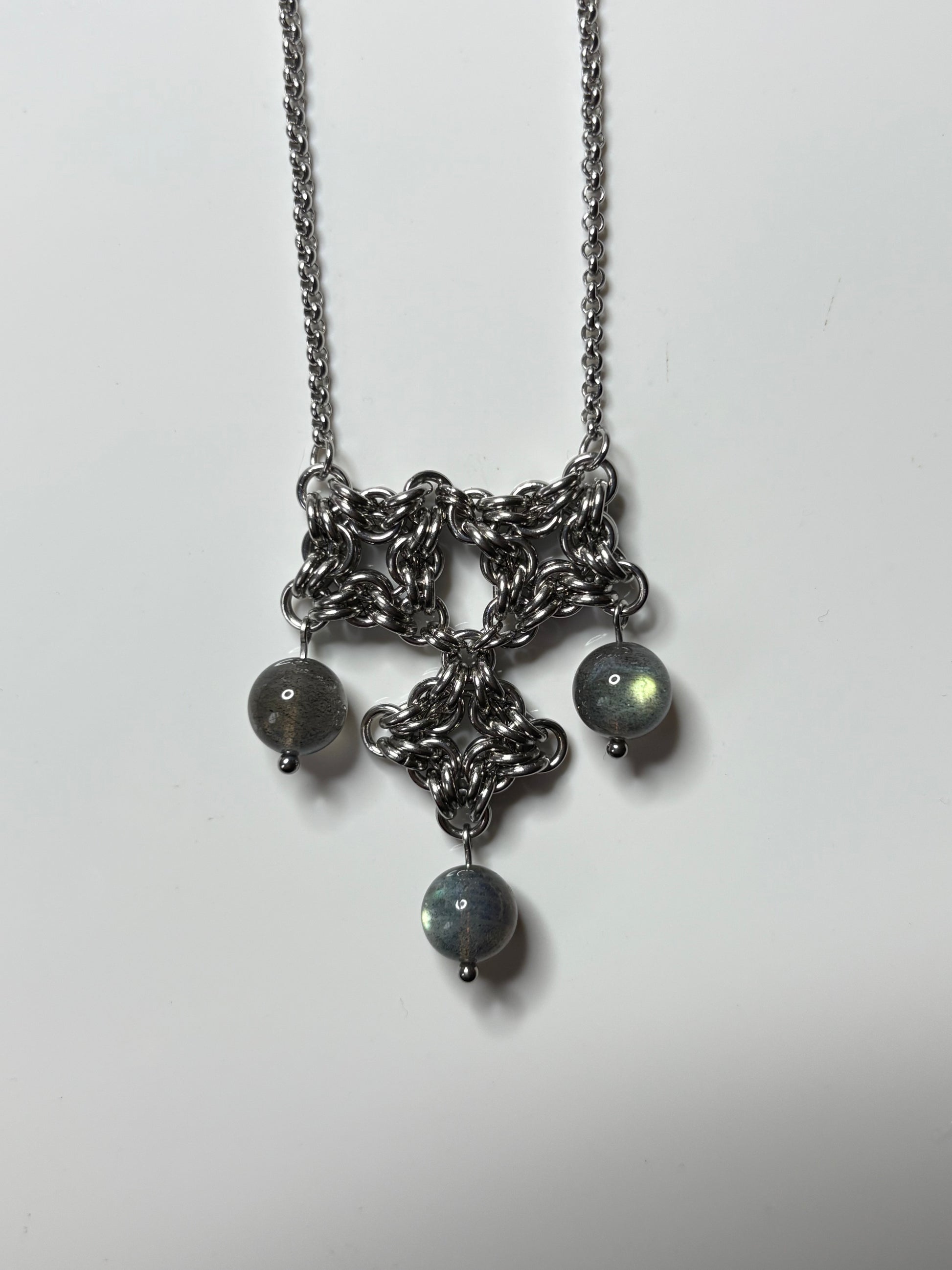 Regal, delicate, understated glamour. Handmade from stainless steel, weaved into an intricate pattern with three labradorite beads hanging from the bottom. Each bead has a vivid blue-green flash (labradorescence) that becomes visible when moved.