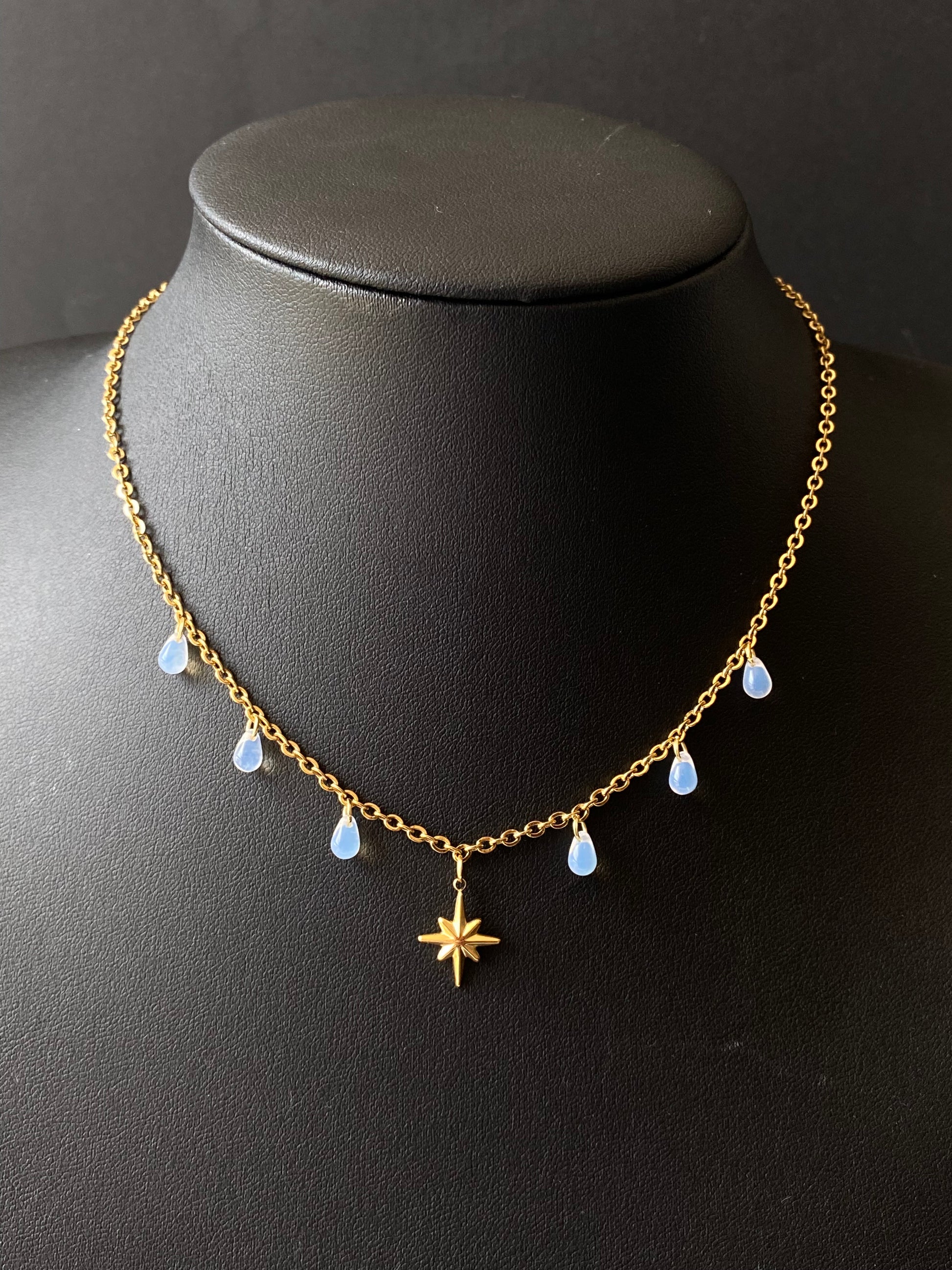 With a north star pendant and six iridescent beads, ASTRID is a an everyday luxury. Assembled by hand from 18k gold plated stainless steel chain/clasp, Czech glass beads and a 24k gold plated stainless steel star pendant. Each necklace comes with a 5cm extender chain. Please read the size guide before placing an order.