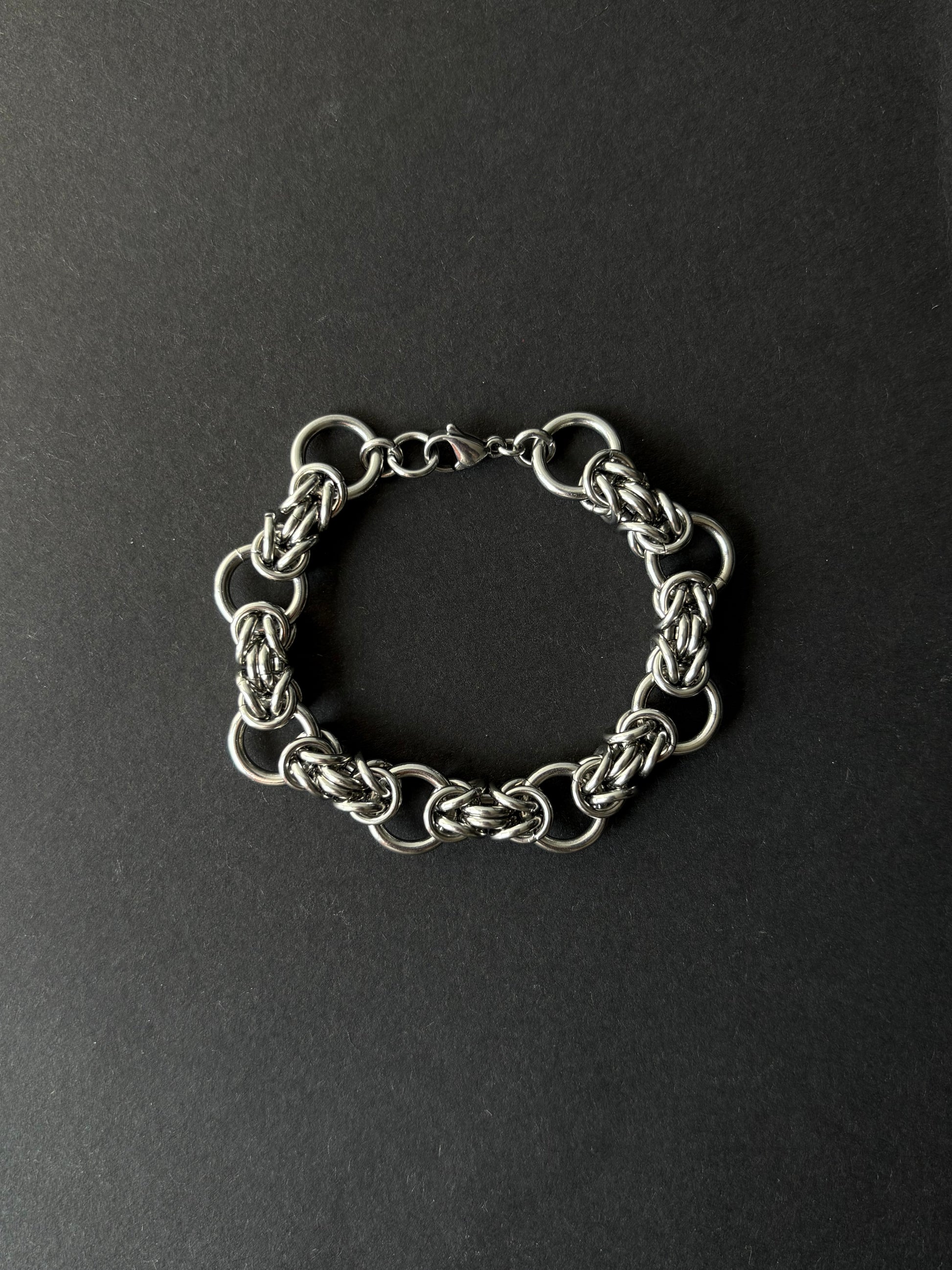An everyday bracelet with a punch. Handmade from solid stainless steel rings and joined with stainless steel fixings. Stainless steel is rust-resistant and durable, making our chainmail pieces an everyday staple. AURA also comes as a necklace.