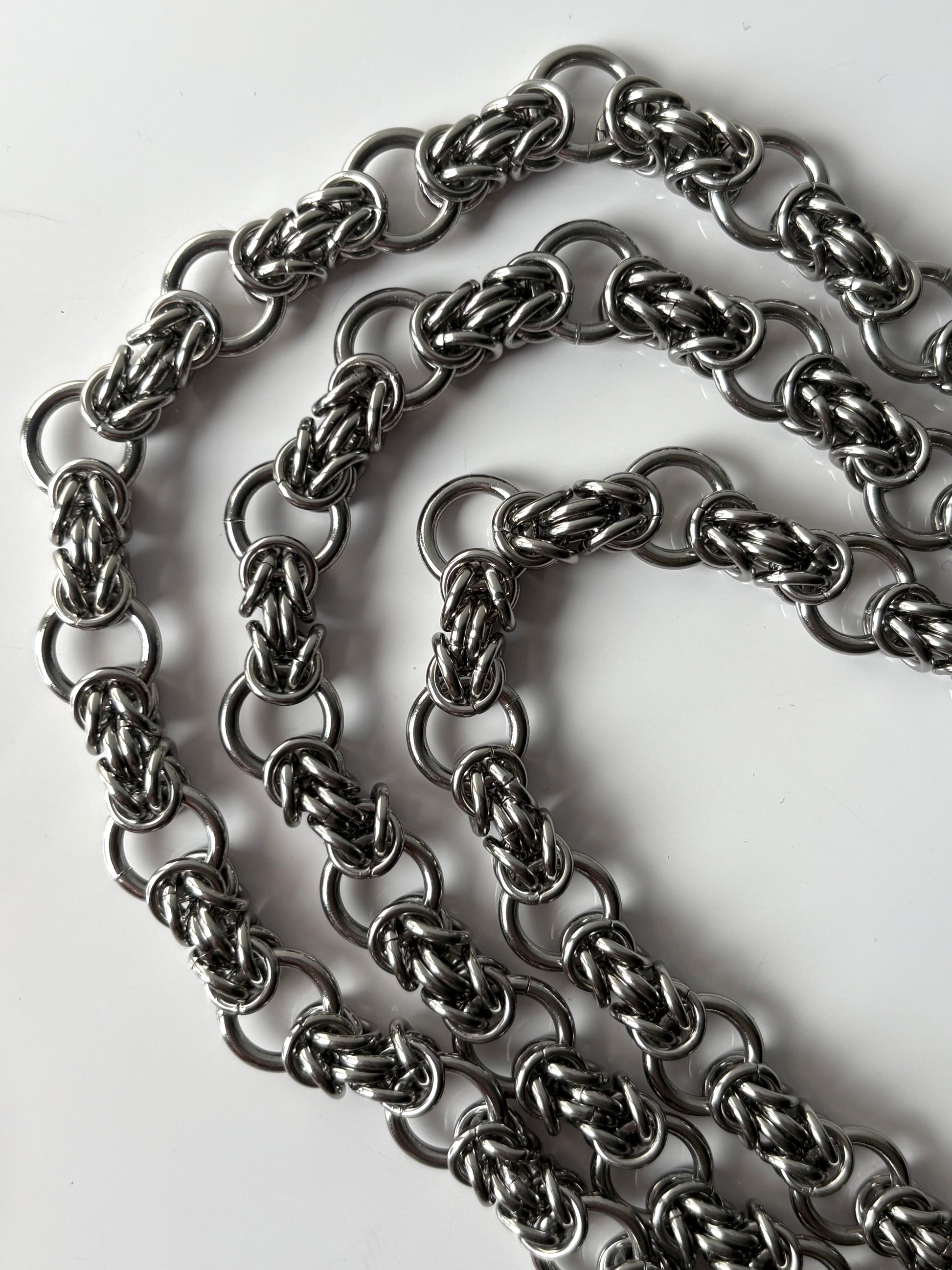 AURA is a simple yet elegant chainmail necklace which looks great as a collar, choker or longer chain. The decorative extender chain, complete with a BTD tag, allows this necklace to be worn loose or flush to the skin.