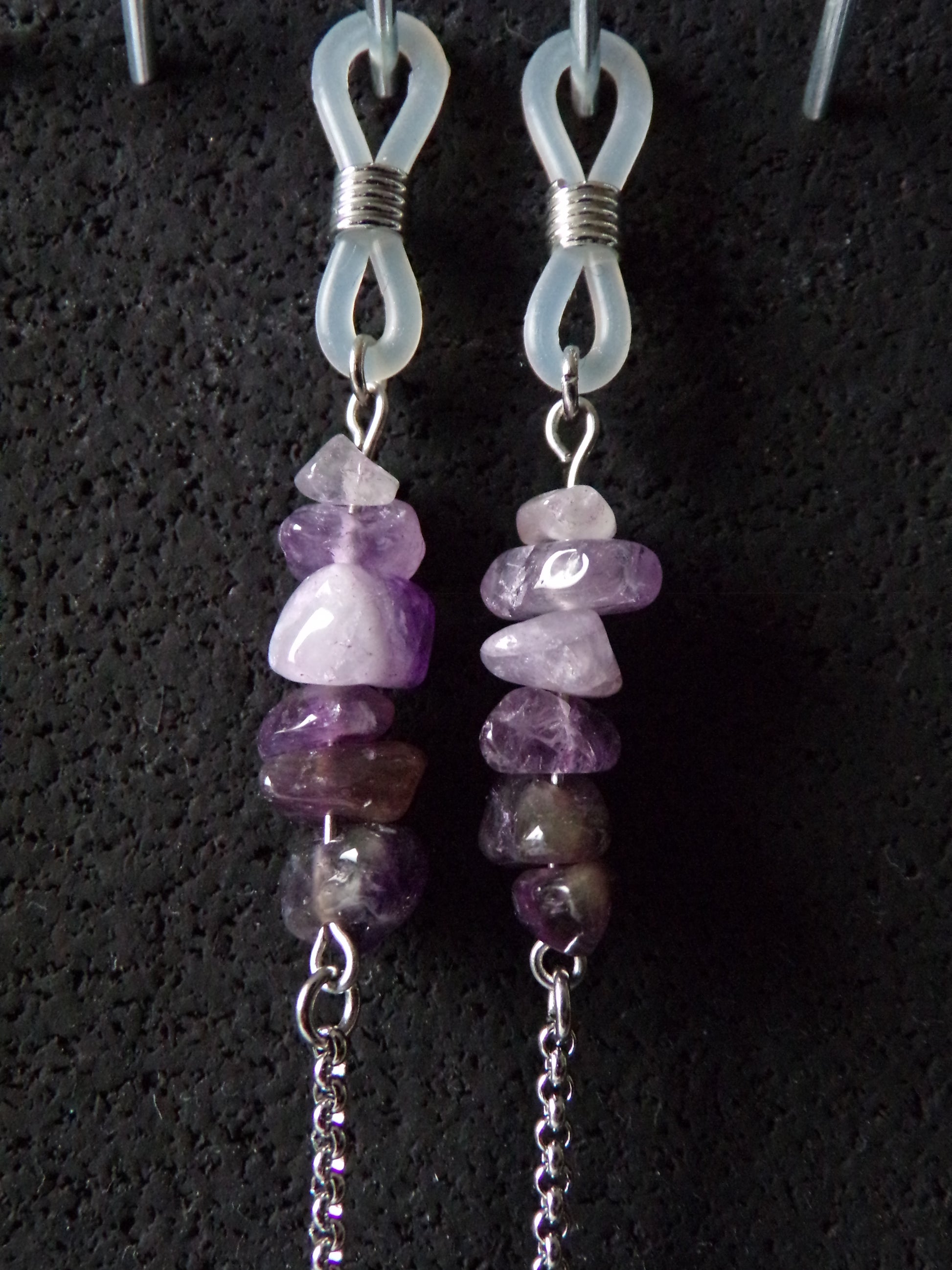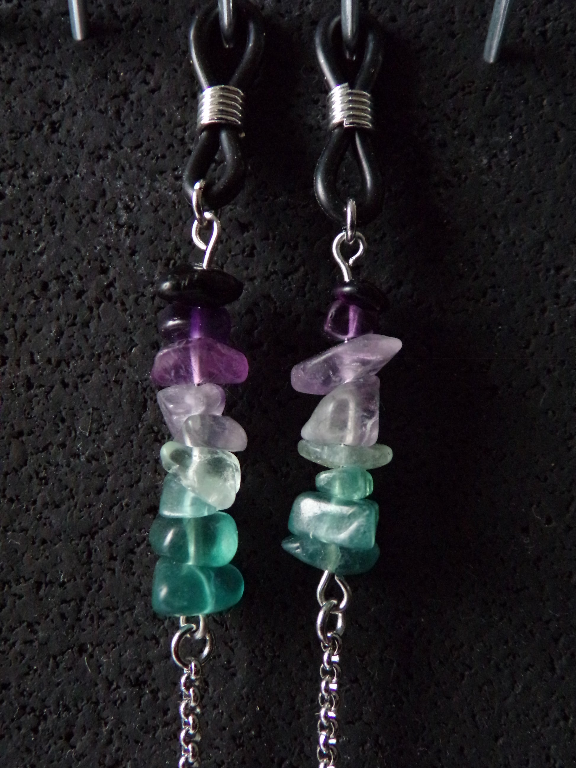 Adorn your glasses with these semi-precious chains! Pick from 10 colourful options: freshwater pearls, rose quartz, blue lace agate, aquamarine, moss agate, aventurine, fluorite, amethyst, garnet, and sunstone. Assembled by hand from solid stainless steel chain, rubber glasses loops and real crystal chips/freshwater pearls. Each variation has only one piece available. Chains are approximately 60cm.