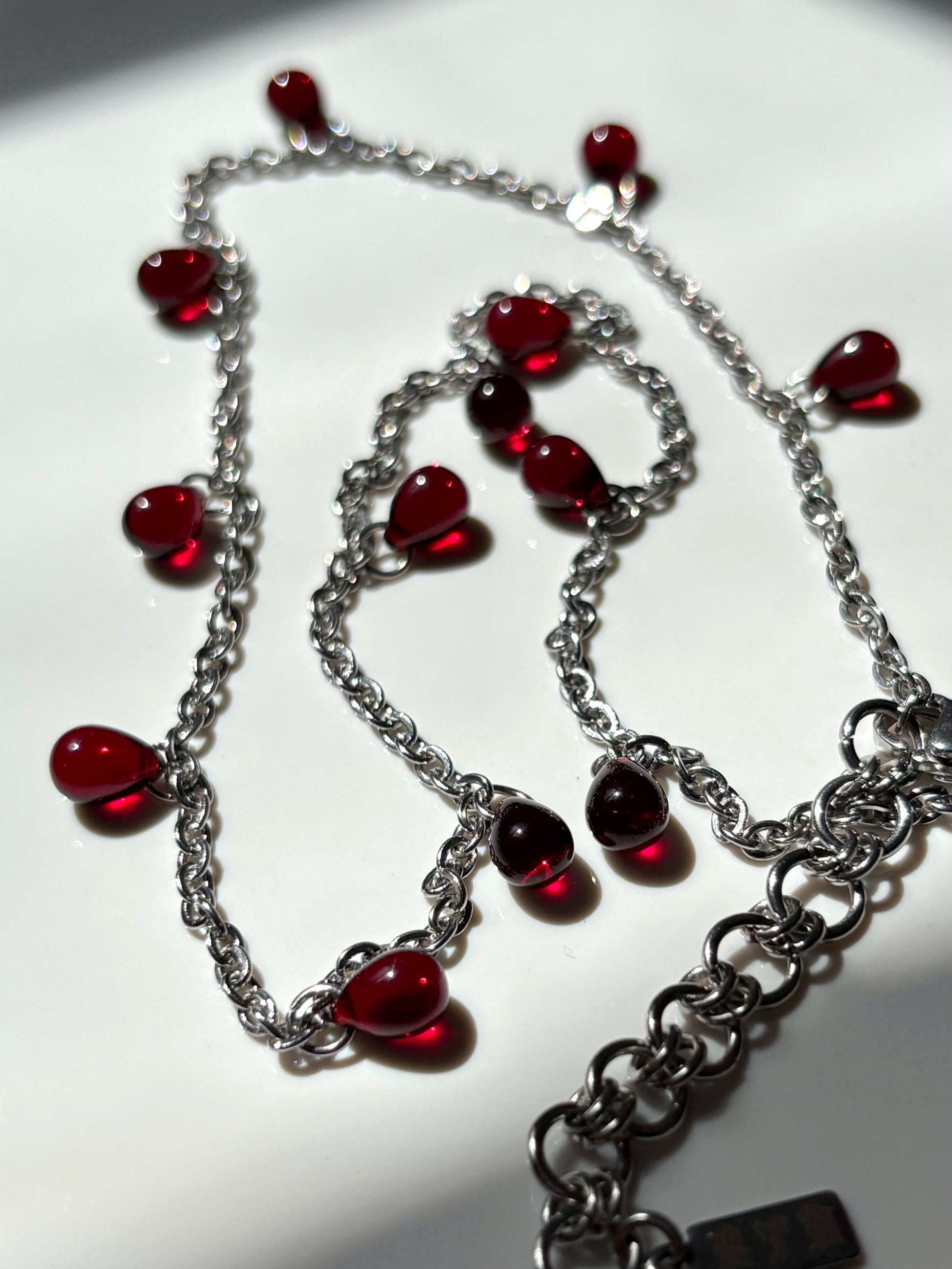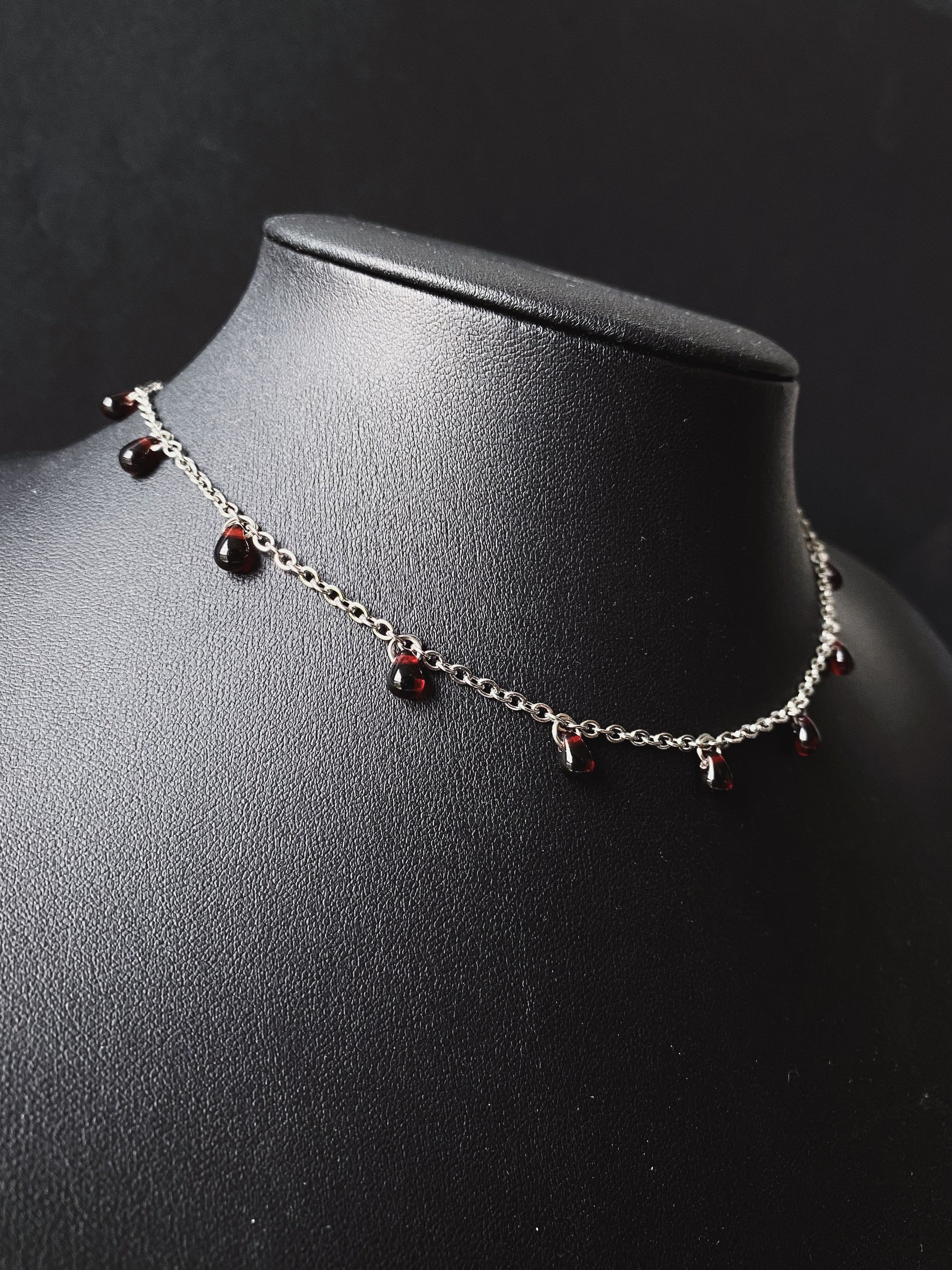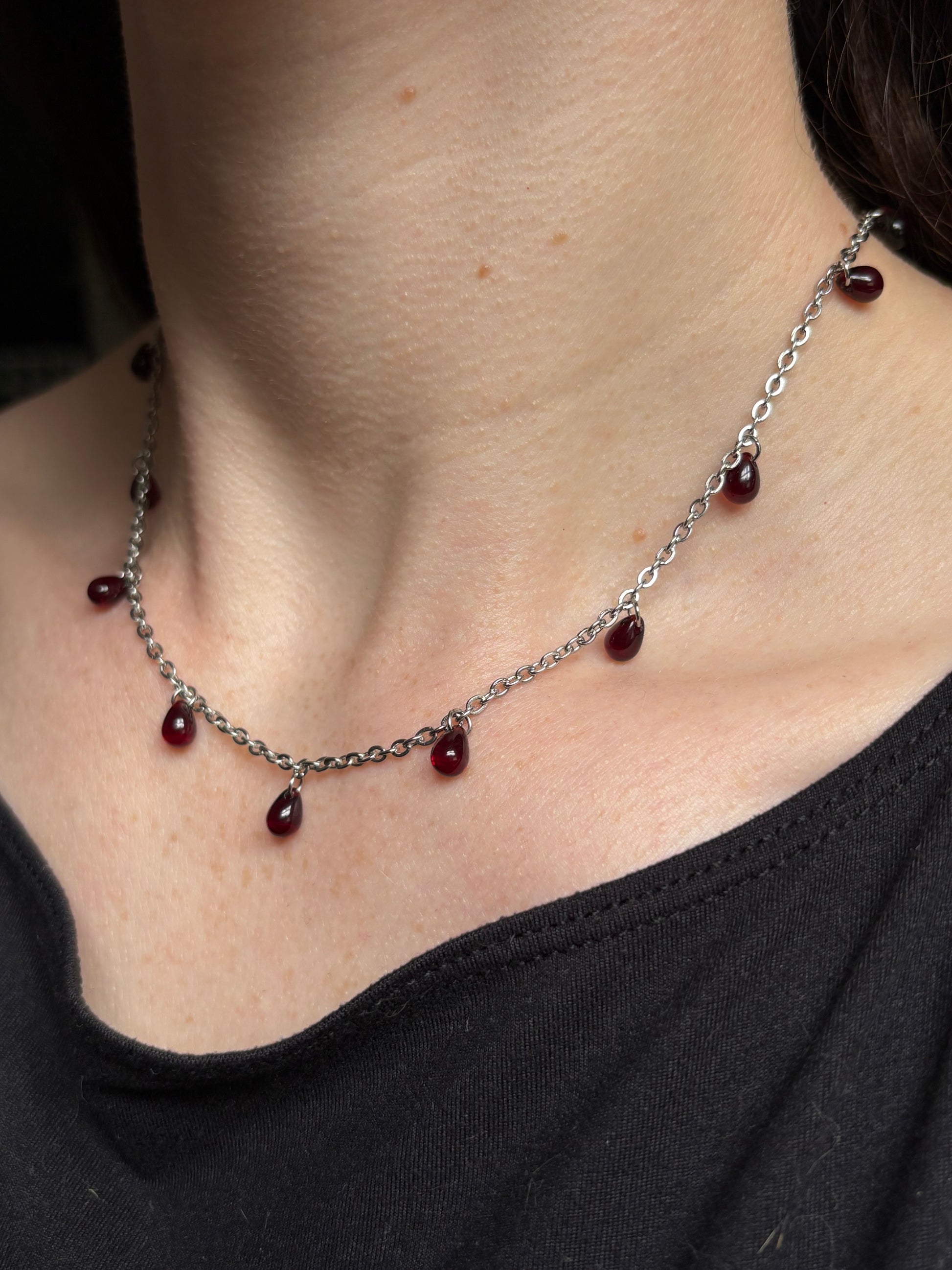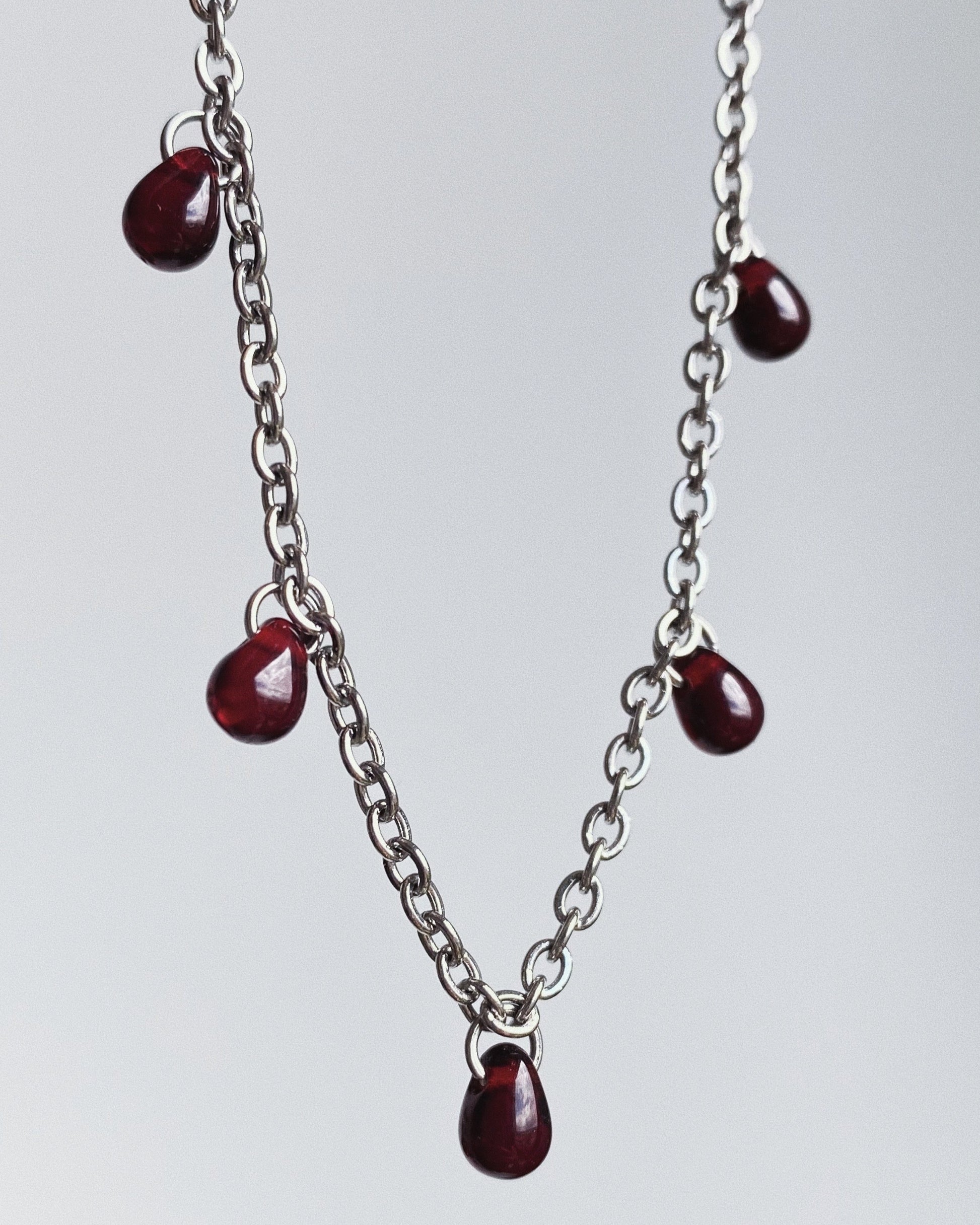 CULLEN's imitation blood droplets and dainty chain were heavily inspired by all things vampire. Handmade to order from solid stainless steel chain, joined with a stainless steel closure and adorned with deep red Czech glass teardrop beads. Stainless steel is rust-resistant and durable, making our chainmail pieces an everyday staple.