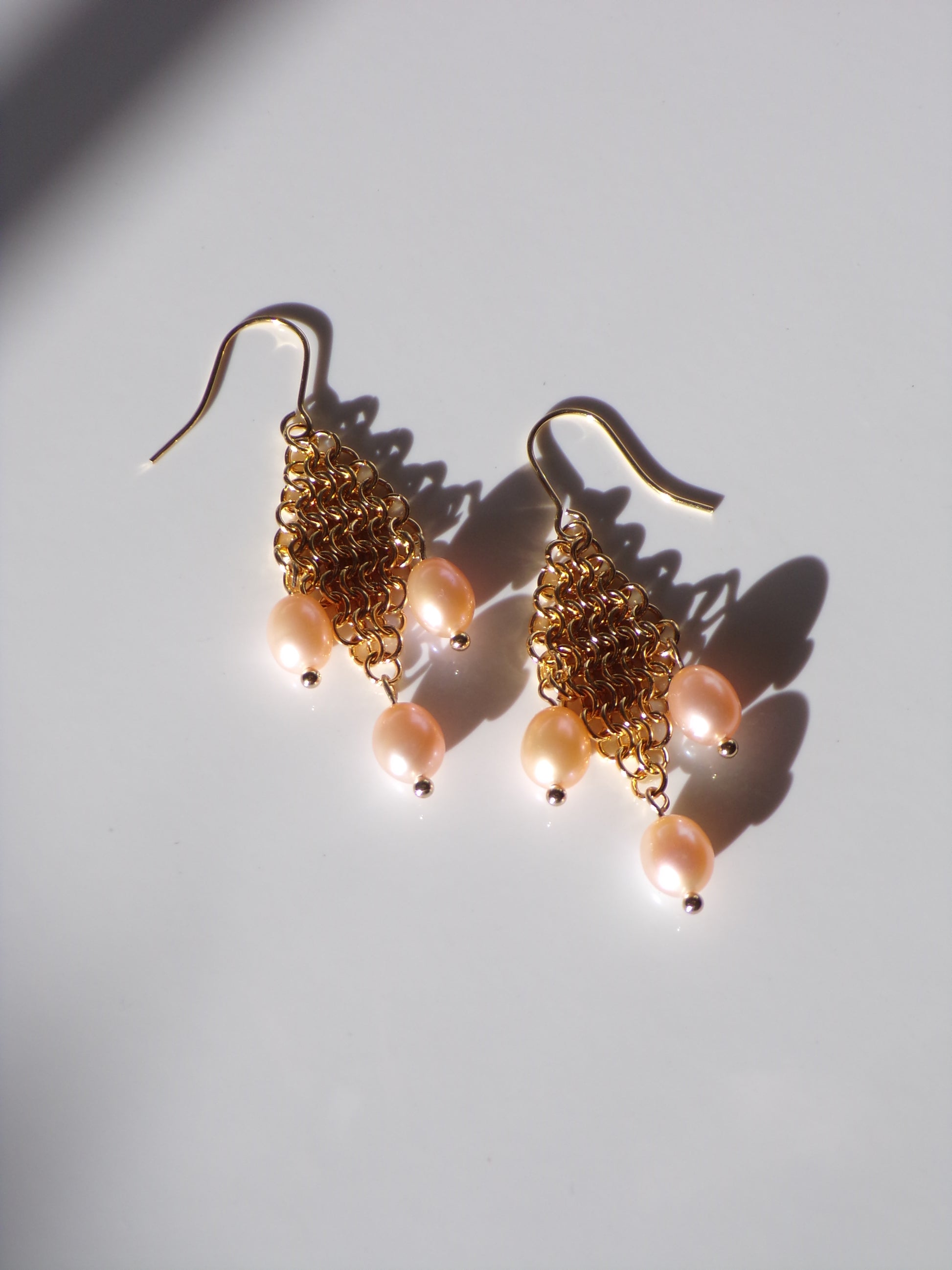 After feedback from the community, I decided to remake LORELAI in gold with slightly larger diamonds to be more balanced both in colour and size. Each gold chainmail diamond is dripping with three high quality peach-toned stones. Real pearls have a unique lustre that can't be replicated, meaning these will shimmer and colour shift in the sun. Handmade from 24k gold plated stainless steel with freshwater pearls and 24k gold plated stainless steel hooks or hoops.