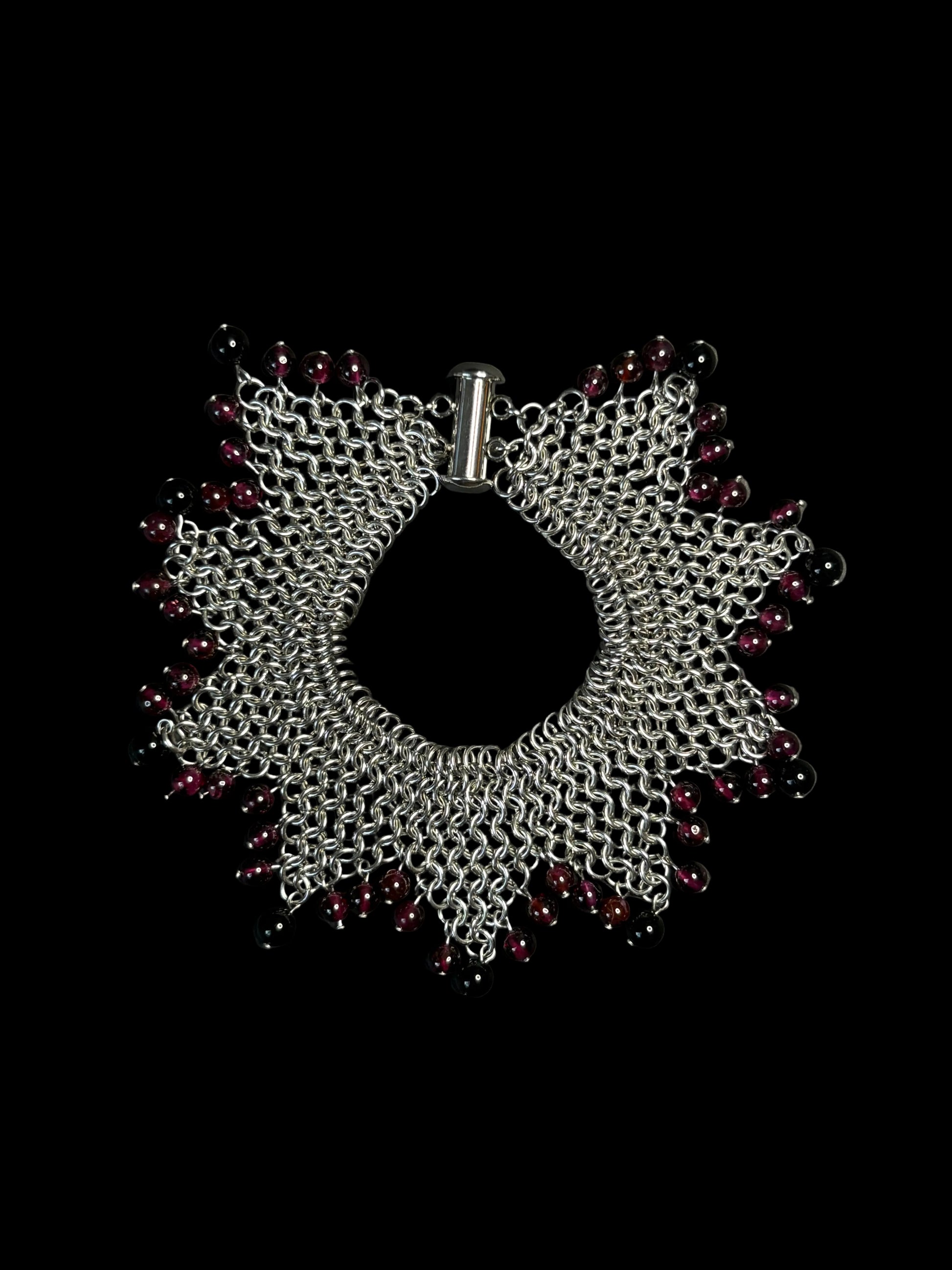 A micromaille accessory for the most fashionable jester! HARLEQUIN is now available as a bracelet, adorned with tiny garnet and onyx beads to bring in the black and red elements of a traditional jester collar.