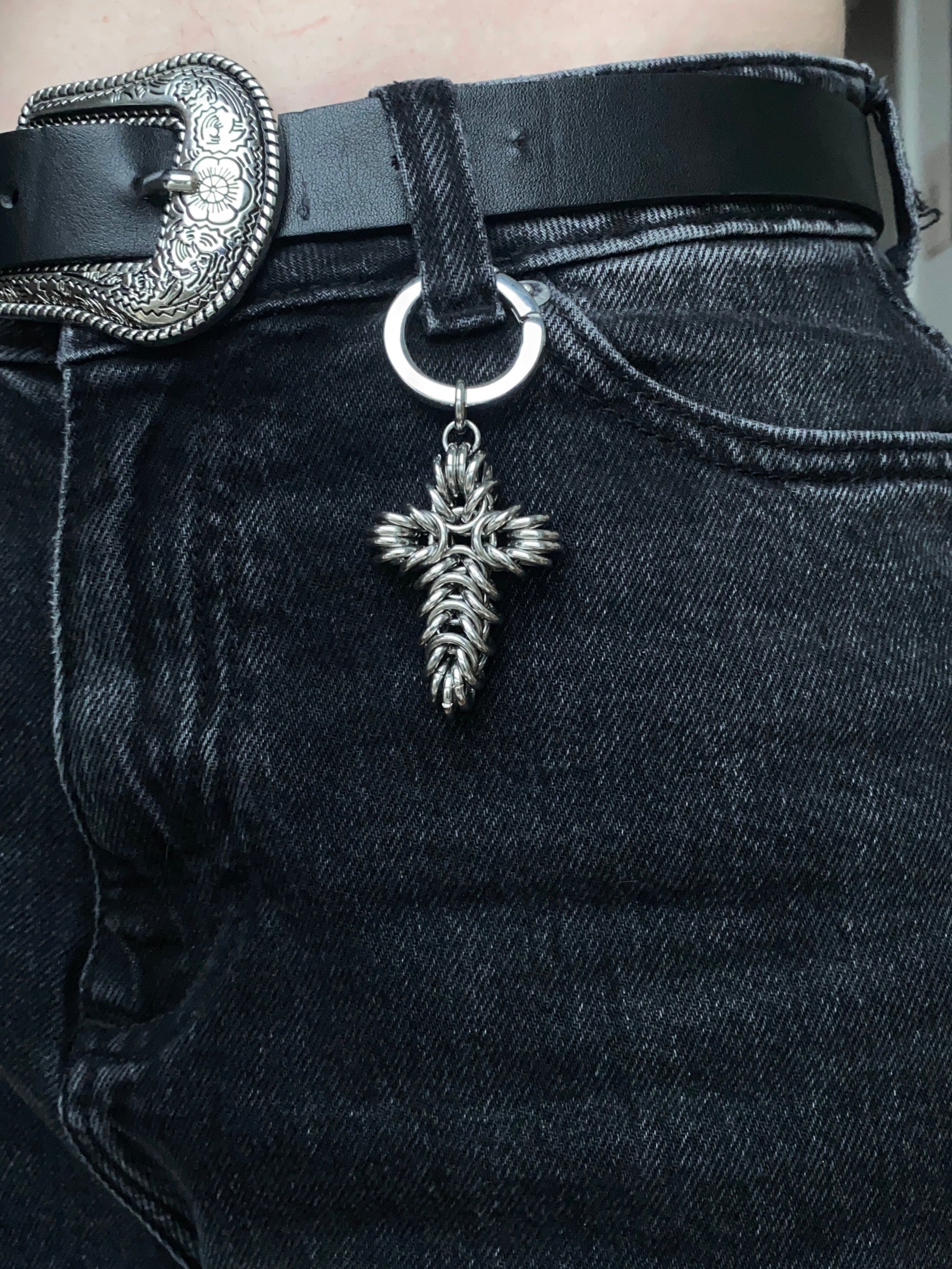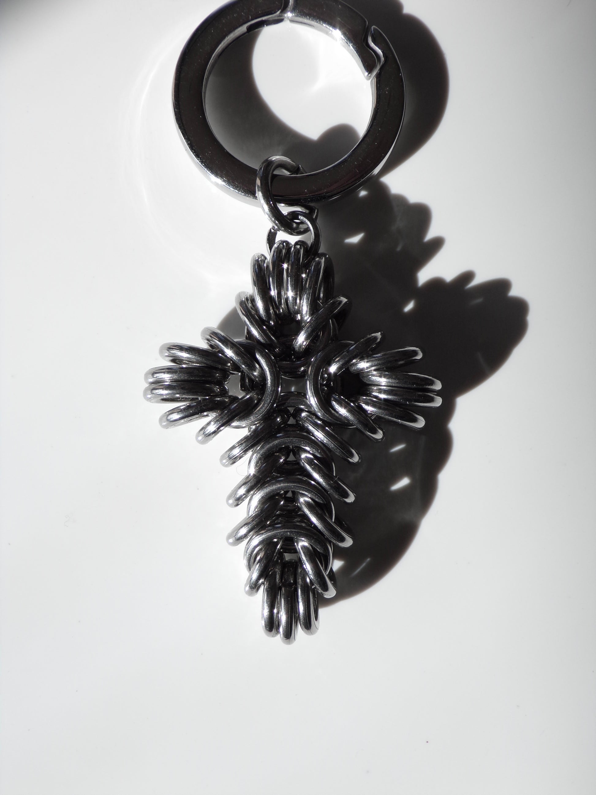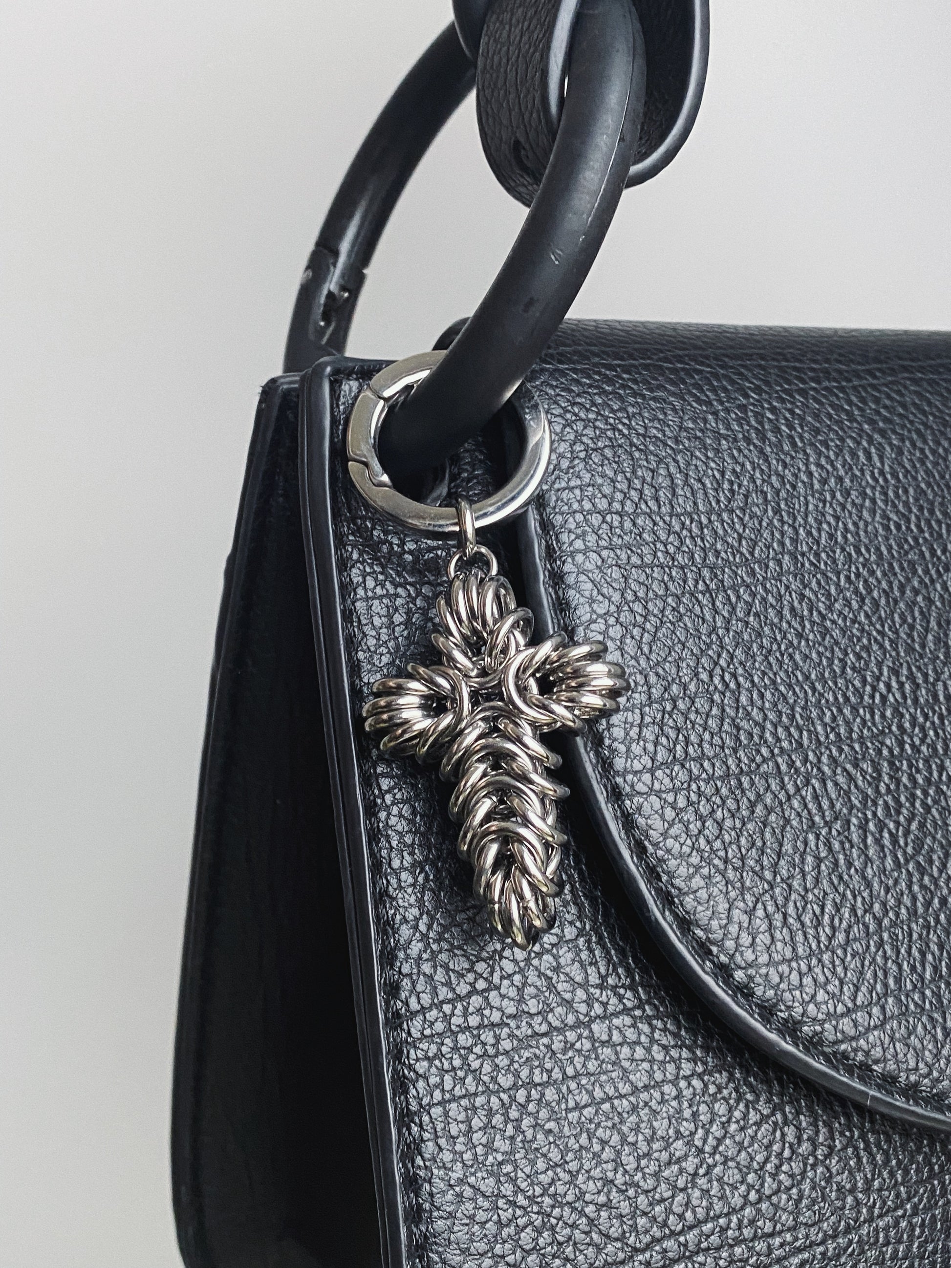 This multi-functional cross pendant is a perfect adornment for bags, belt loops, boot tags, or even adding to existing jewellery. JUDAS is handmade from solid stainless steel chainmail with a stainless steel spring gate o-ring clasp.