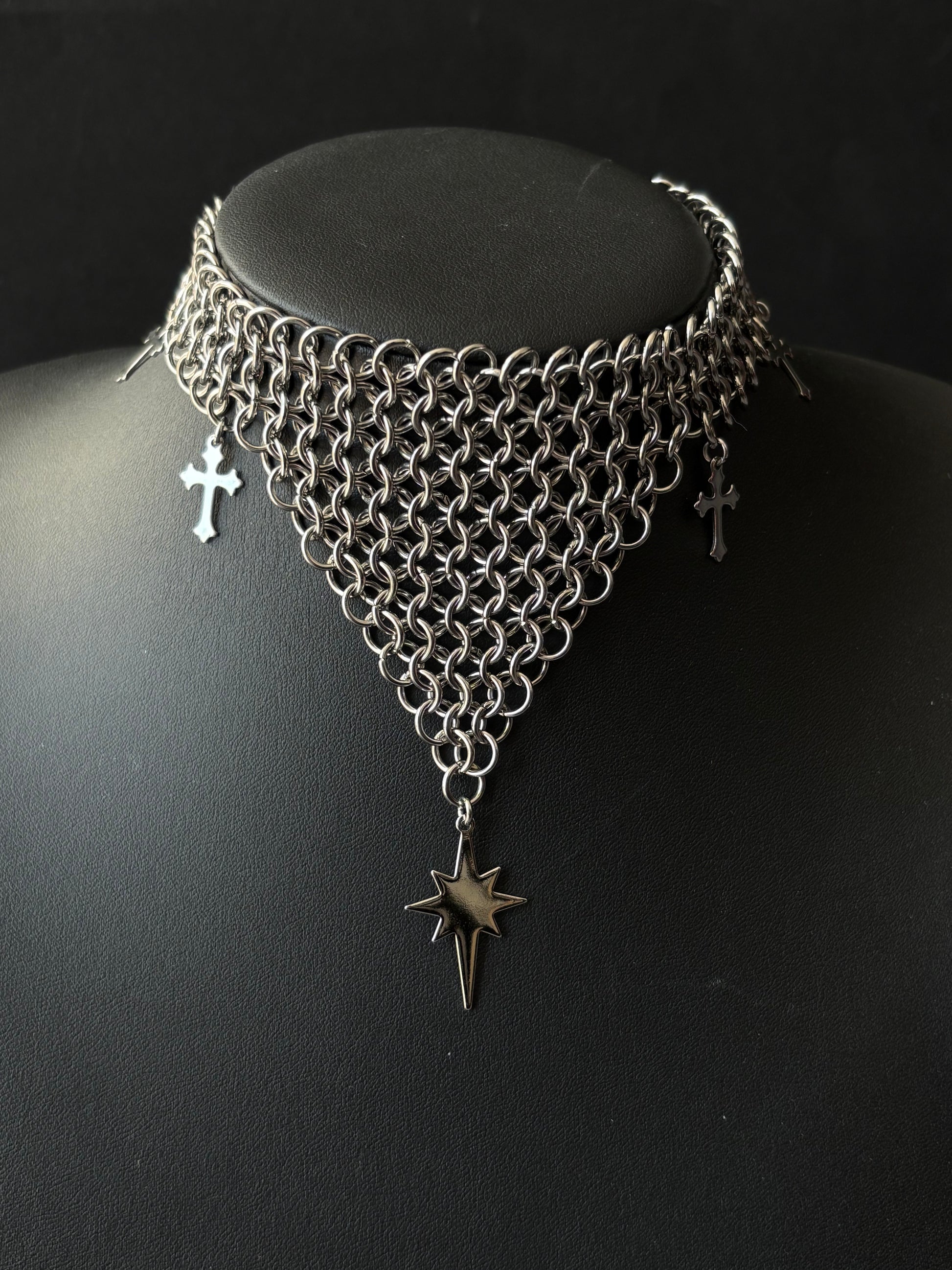 Handmade in a European 4-in-1 weave from solid stainless steel rings, joined with a stainless steel lobster clasp and adorned with stainless steel & Rhodium plated pendants. Stainless steel is rust-resistant and durable, making our chainmail pieces an everyday staple.