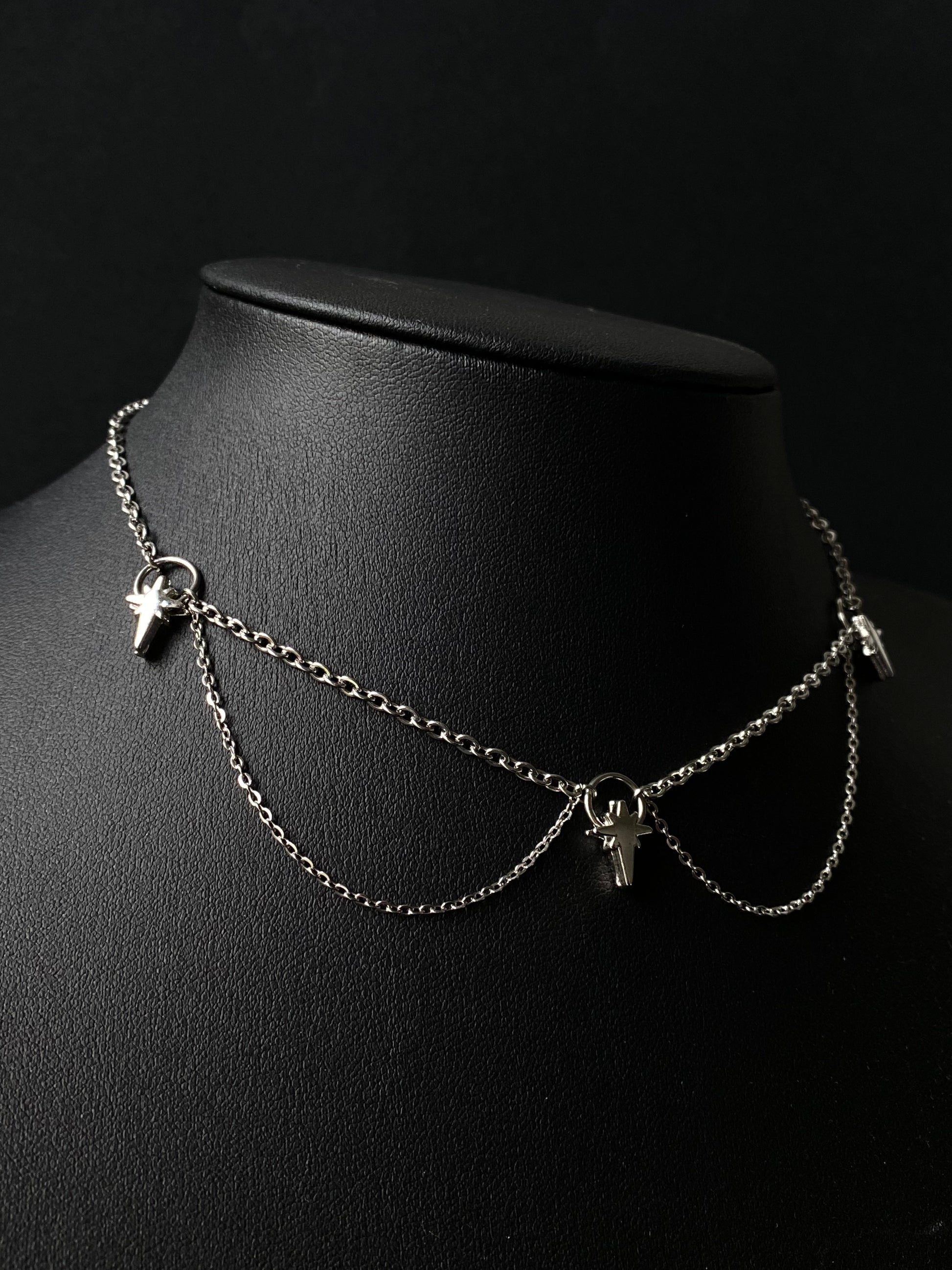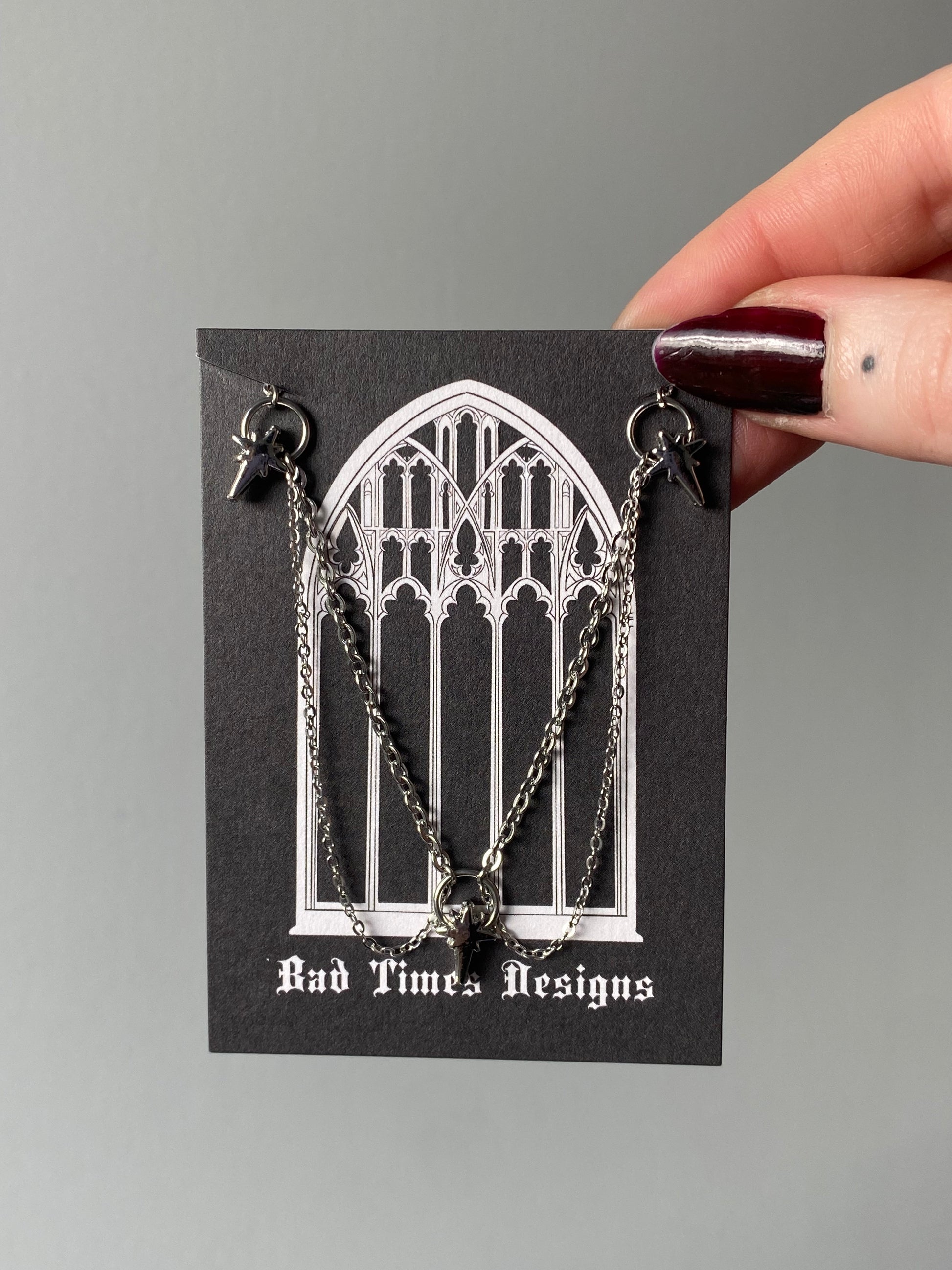 A danity necklace is a fashion staple. This chandelier choker necklace is one of our most beautiful and ethereal pieces of jewellery, with three North Star beads and draped chains. ORION is handmade with solid stainless steel chains and fixings, and rhodium plated North Star beads. Due to the nature of the hanging chains, ORION is best worn just above or below the collarbones. Each necklace comes with a 5cm extender chain. The model is wearing a size Small.