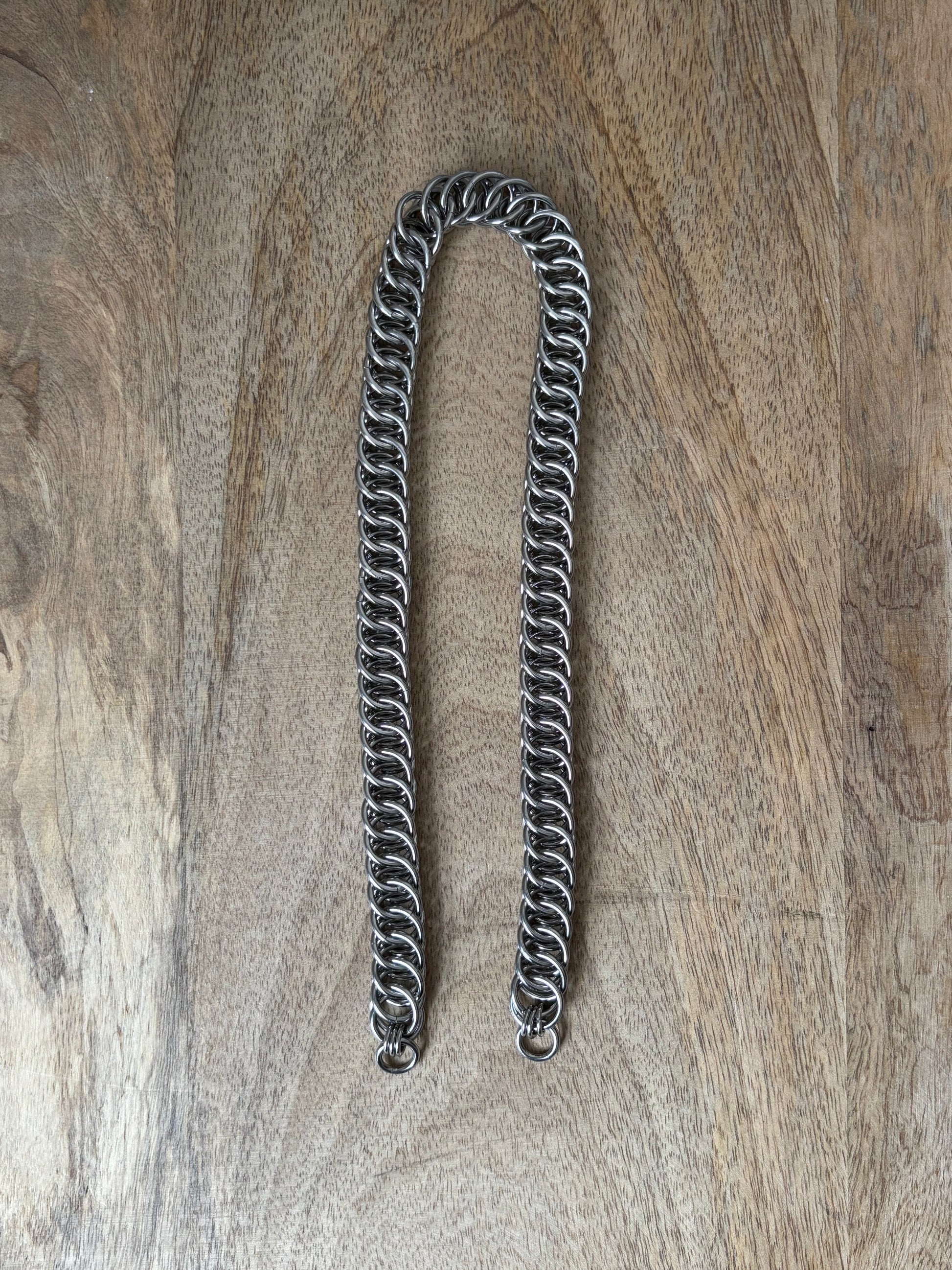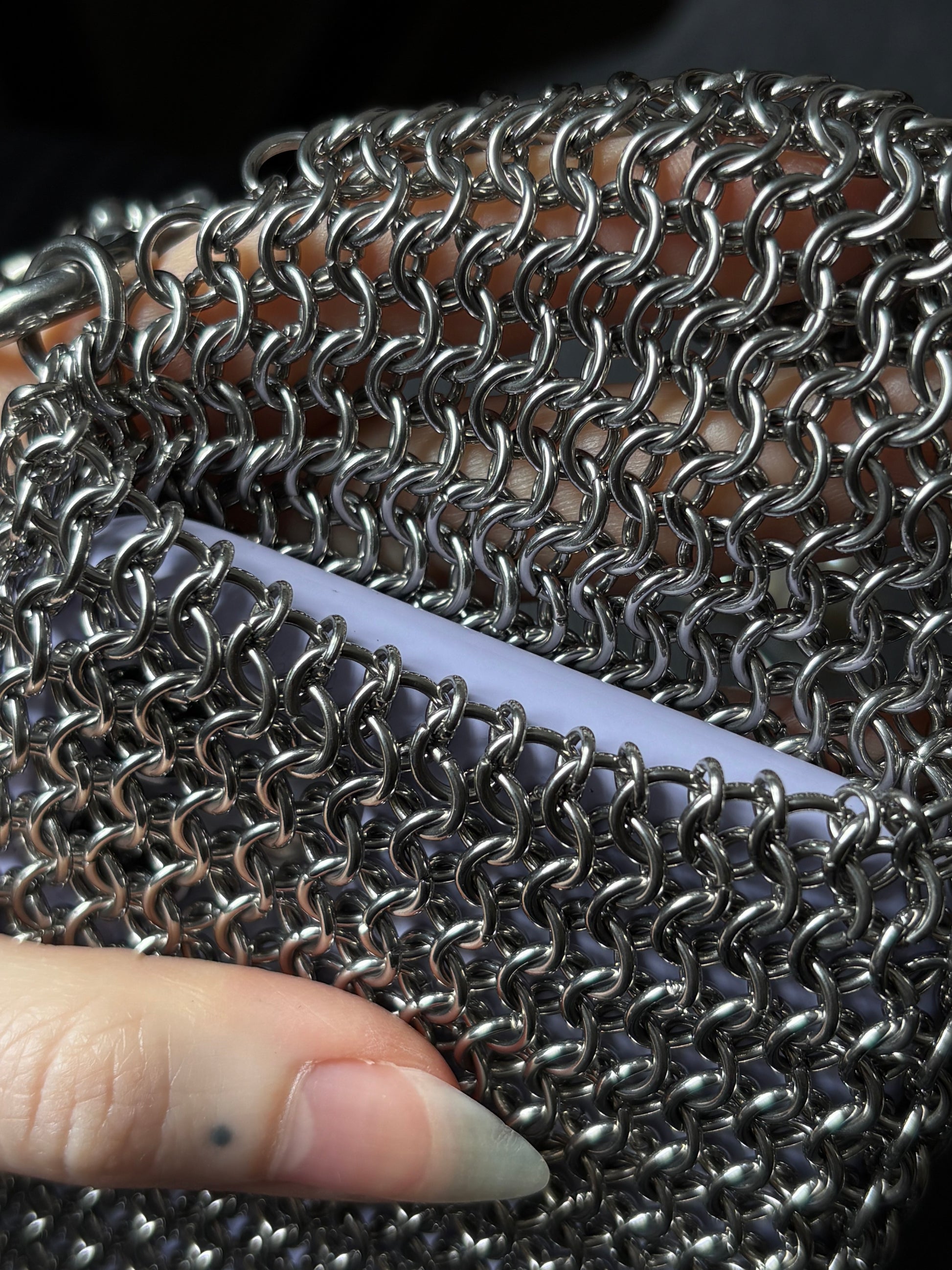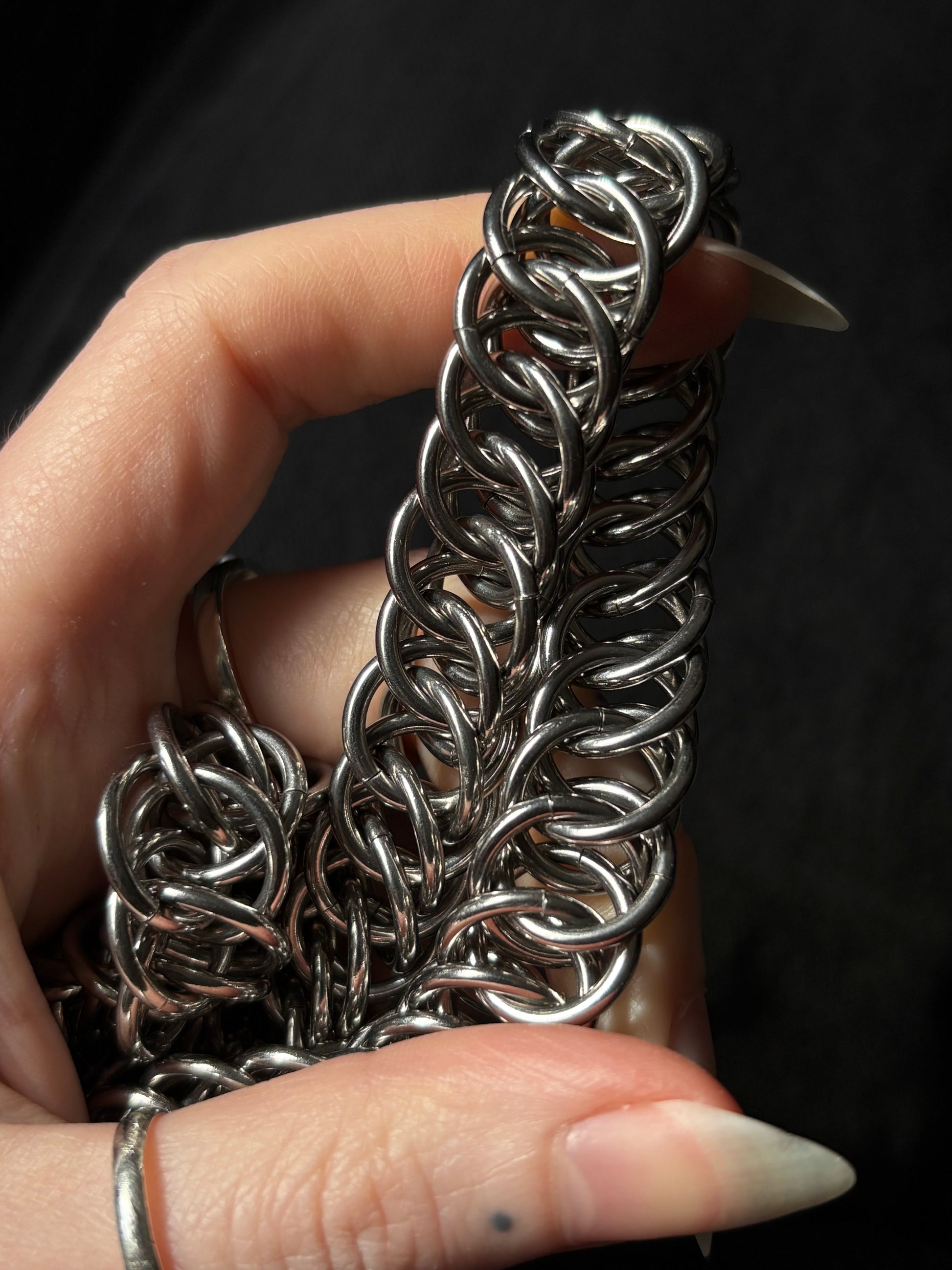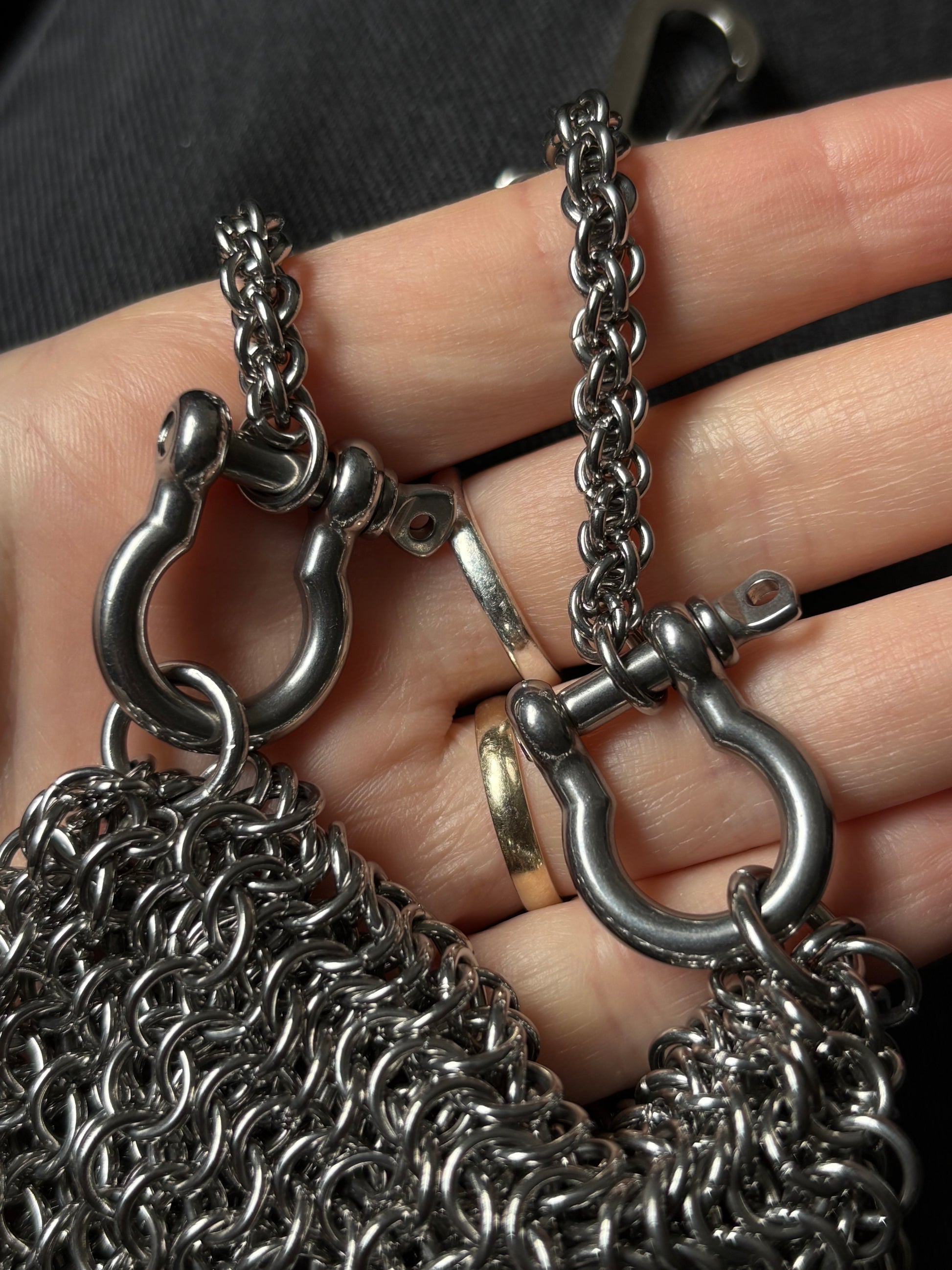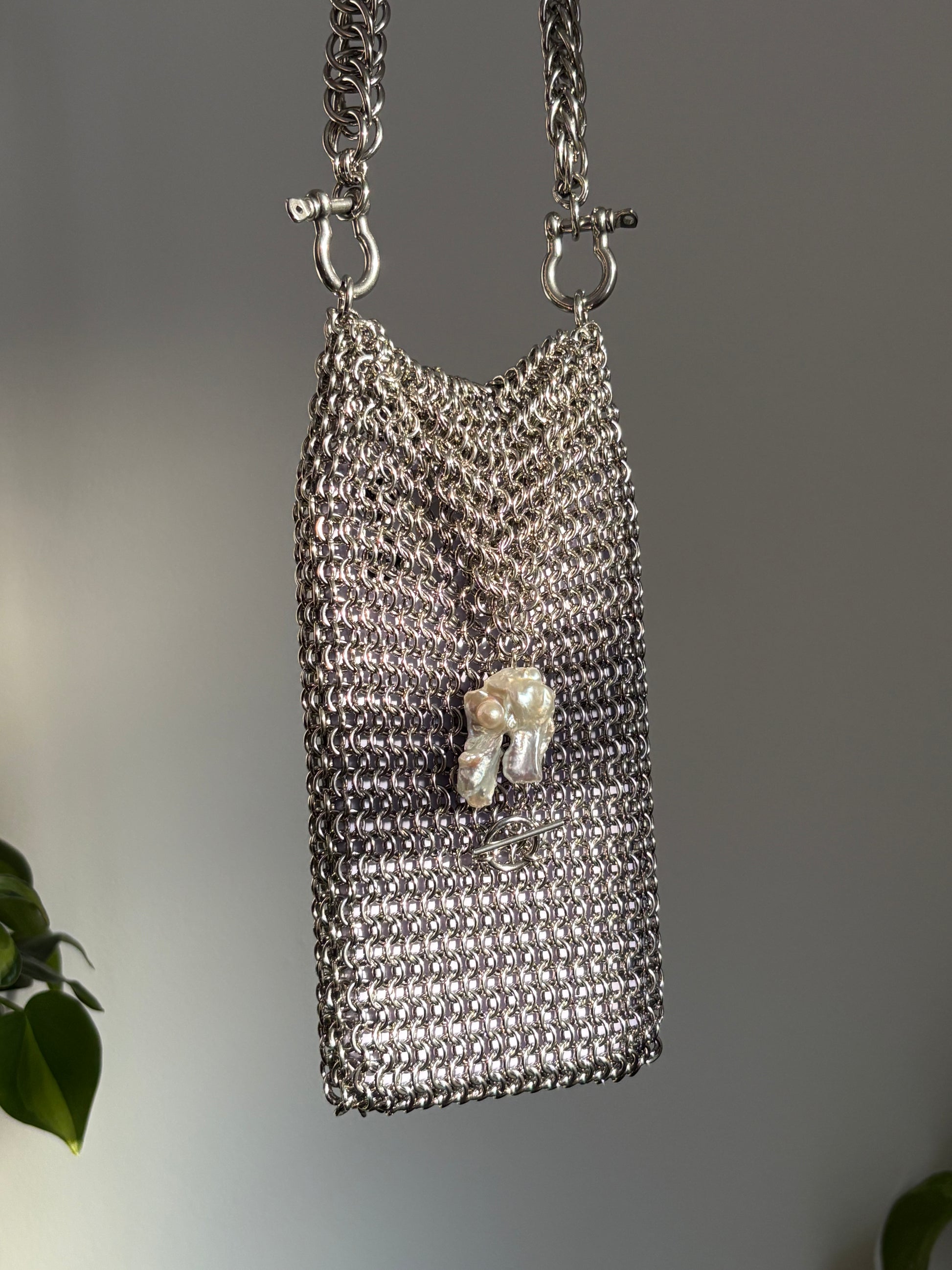 This purse is the first creation in a documented series where you get to choose a pearl and suggest a design. Handmade over the course of 14+ hours across 5 days from solid stainless steel and a large silver-toned Keshi pearl. There were a mix of requests for cross body, shoulder, wrist and clasp straps so this purse comes with two options - a 50cm shoulder strap and a 12cm clasp strap. Straps can be switched out by twisting open the the shackle clasps on the sides of the bag. Head over to the Bad Times social media pages to vote on the next piece!