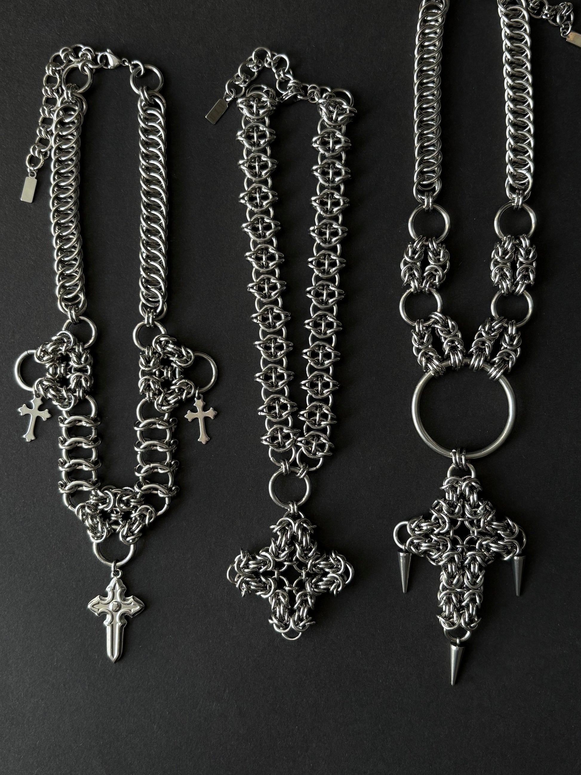 PENANCE is the third of three chunky statement necklaces in the Vice collection, inspired by the darker side of religion; repentance and control. After making the freeform cross pendant, I wanted to make a chain that looks painful, like something that would be used as a punishment. This weave has always reminded me of barbed wire, so I learned to make it just for this piece. But despite its appearance, the chain is very soft and satisfying to hold (and to look at!).