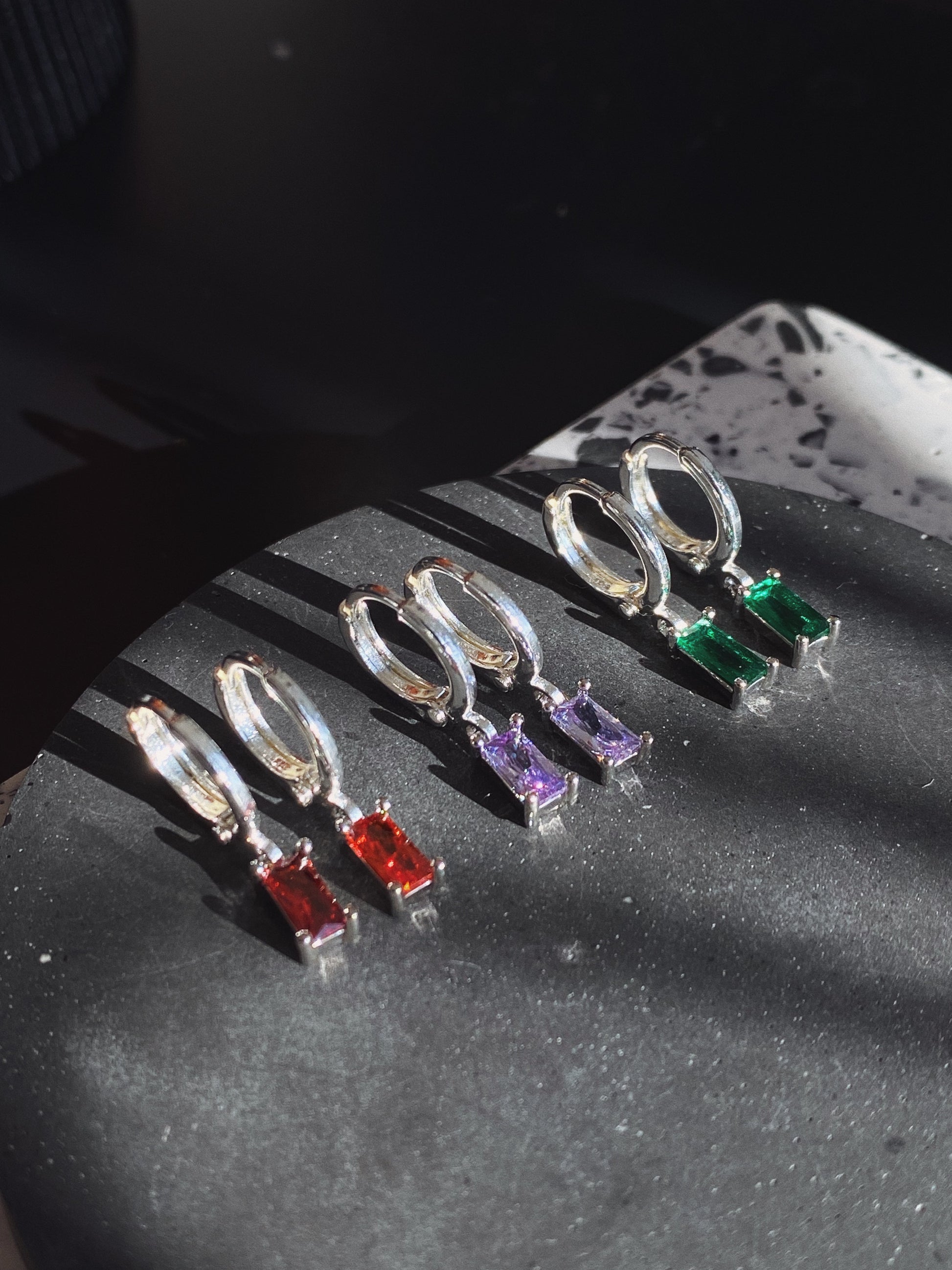 Dainty and subtle crystal glass pendants in rhodium settings on sterling silver plated hinge hoop earrings. Available in three crystal colours: Lilac, Blood Orange and Emerald Green.