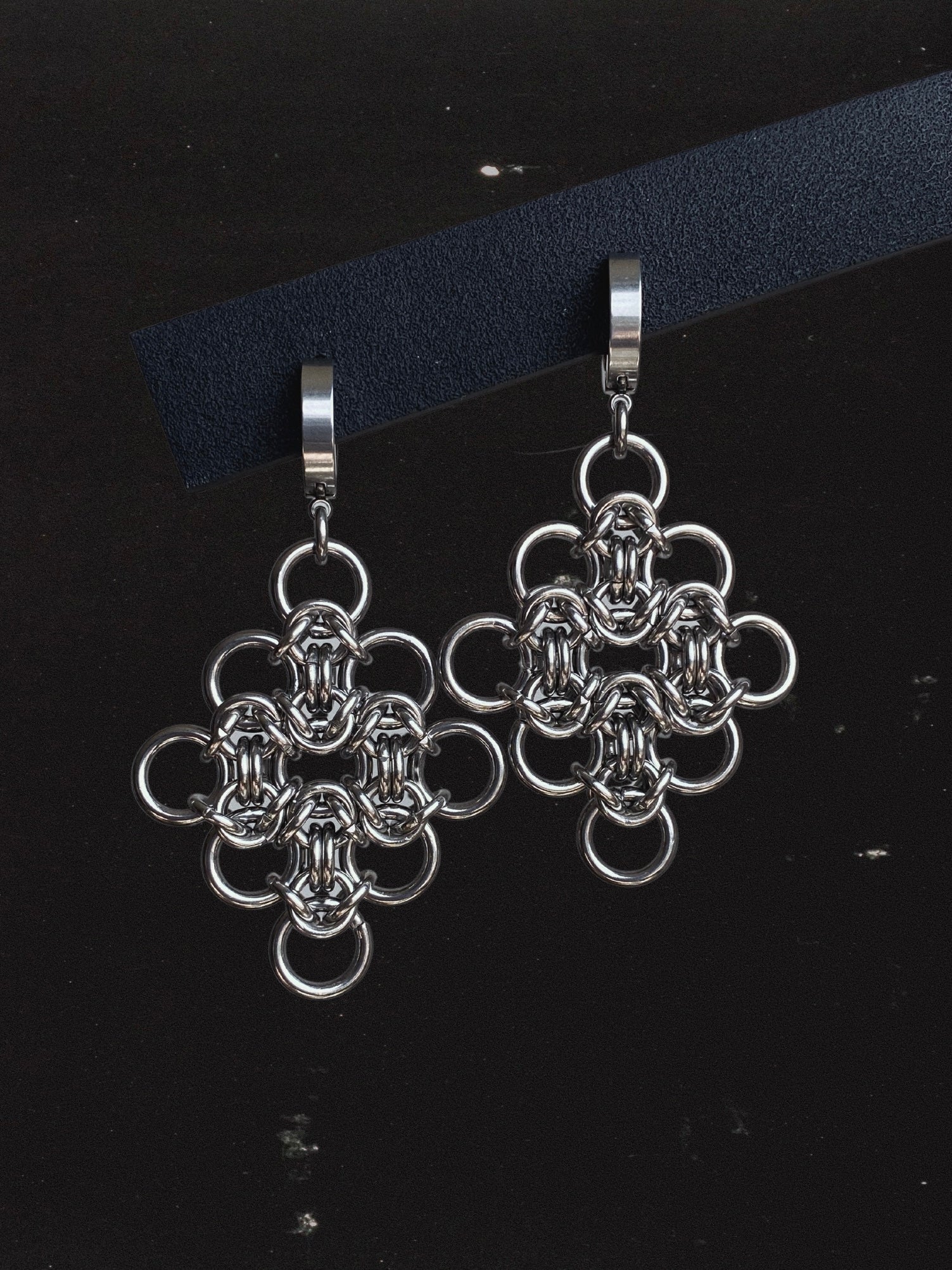 These gorgeous statement earrings use negative space to create the iconic arch shapes of gothic cathedral windows. The unique hand woven pendant is representative of the cinquefoil arches on the main window of my local cathedral. Handmade from solid stainless steel with stainless steel hoops. Also in the TEMPLE range is a necklace and two key rings.