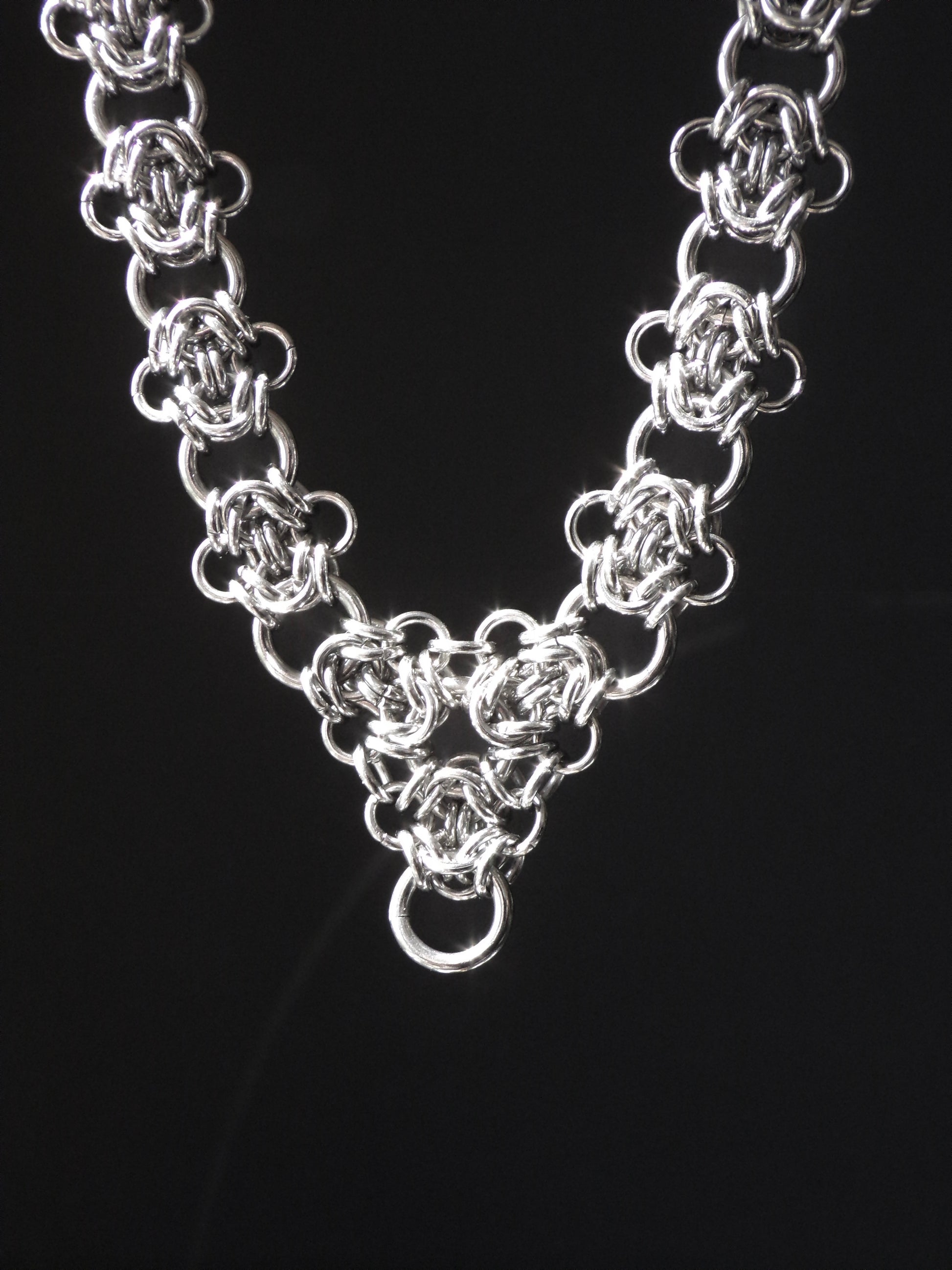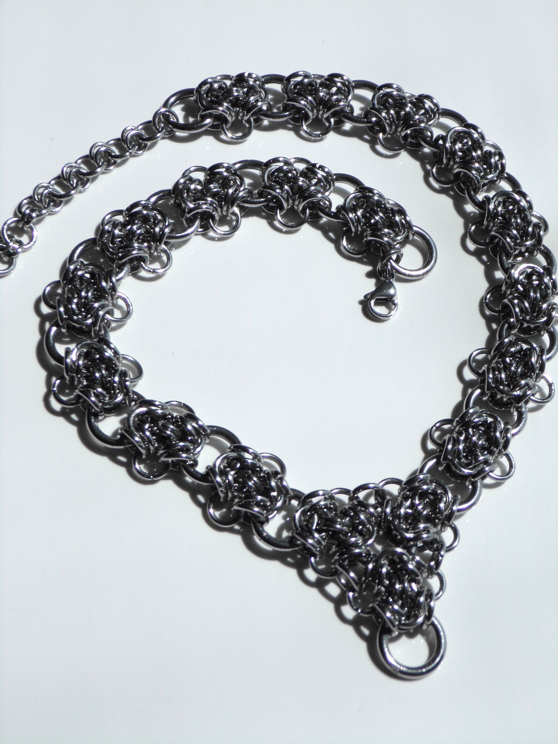 This necklace is handmade from solid stainless steel rings, joined with a stainless steel lobster clasp. Stainless steel is rust-resistant and durable, making our chainmail pieces an everyday staple. Each VESTA necklace comes with a 5cm extender chain. This necklace looks best when worn as a collar.
